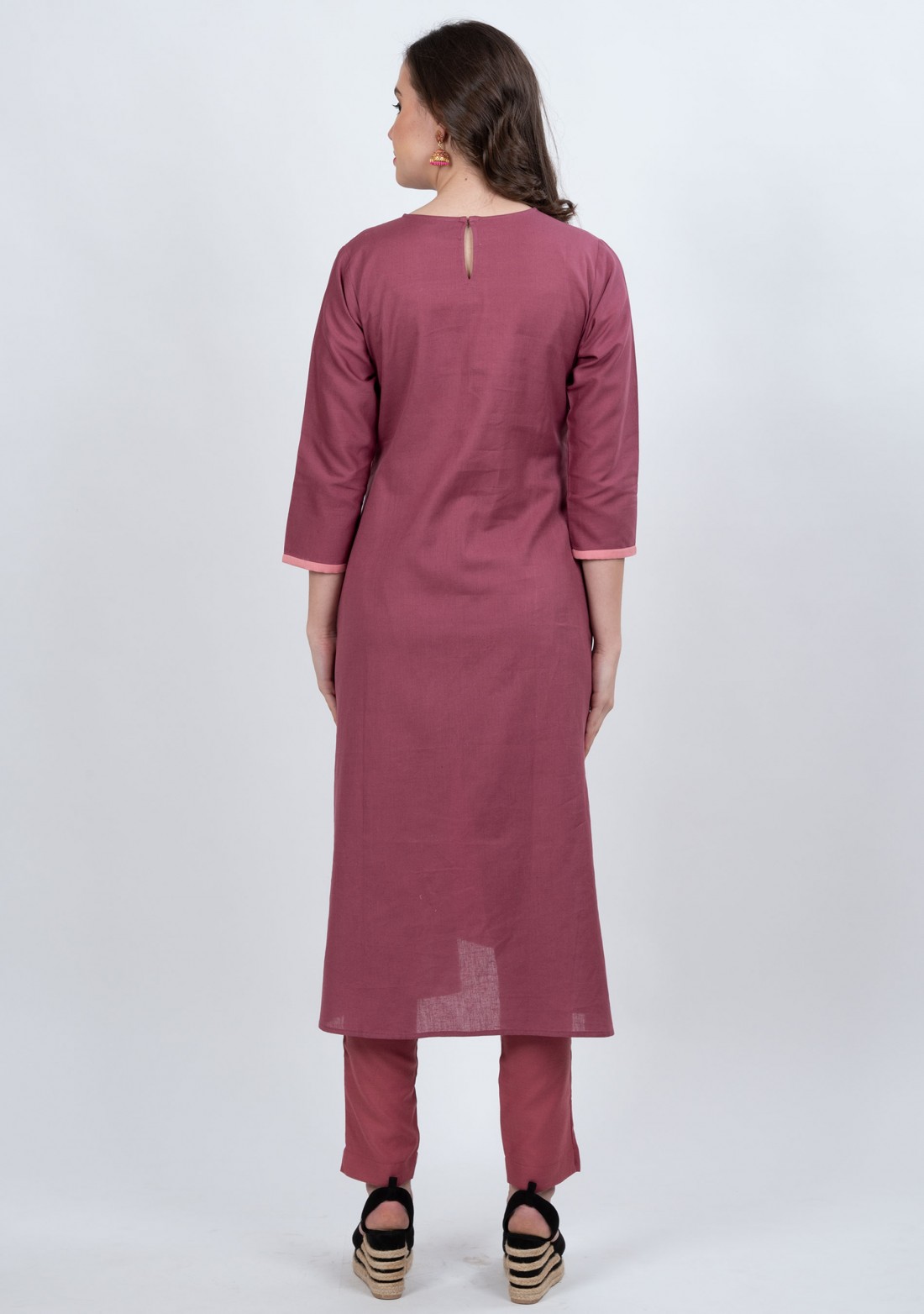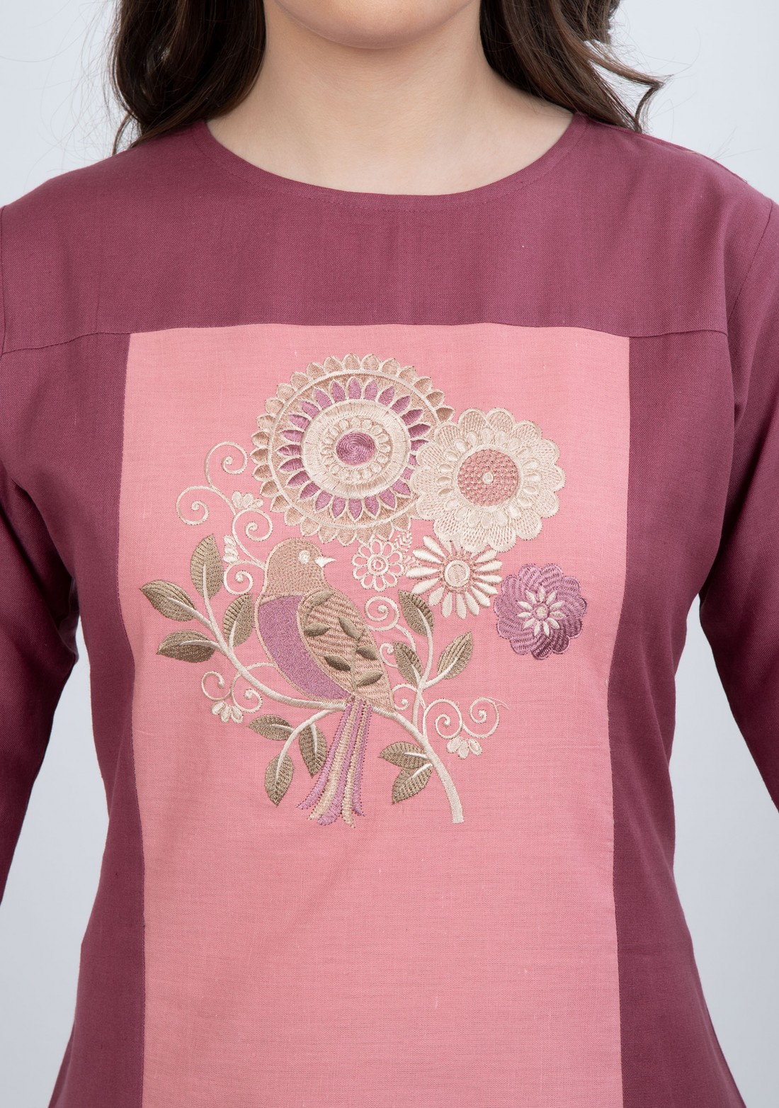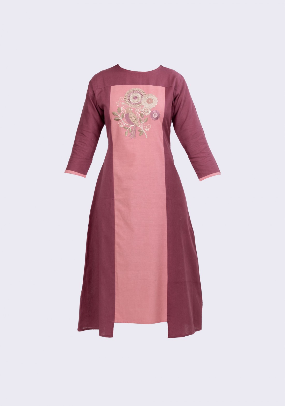 This stitched A-line kurti is adorned with a thread embroidered motif featuring a boat neck, three-quarter sleeves, and asymmetrical front hem. Ideal for casual, office, kitty parties, outings, and weekend get-togethers.
