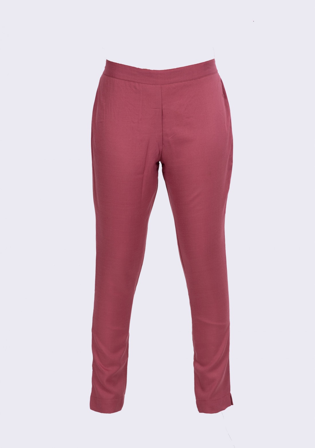 Paired with plum color cigarette pants to create a contrasting effect, along with heels and stylish accessories.