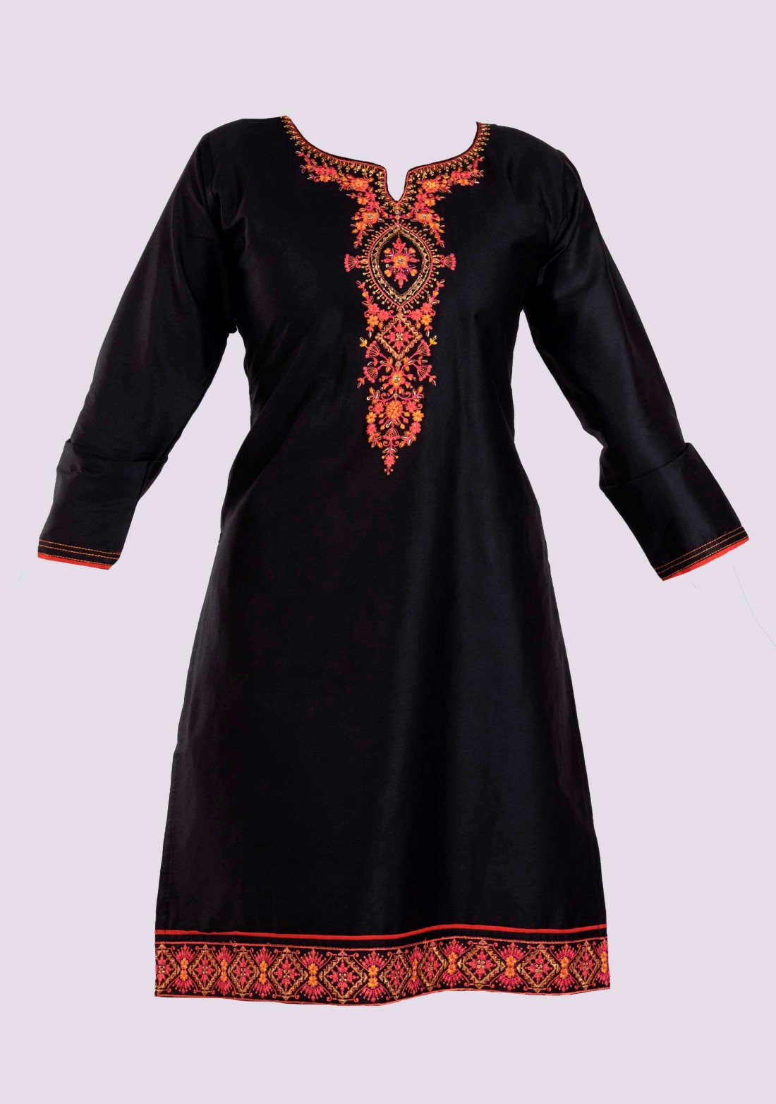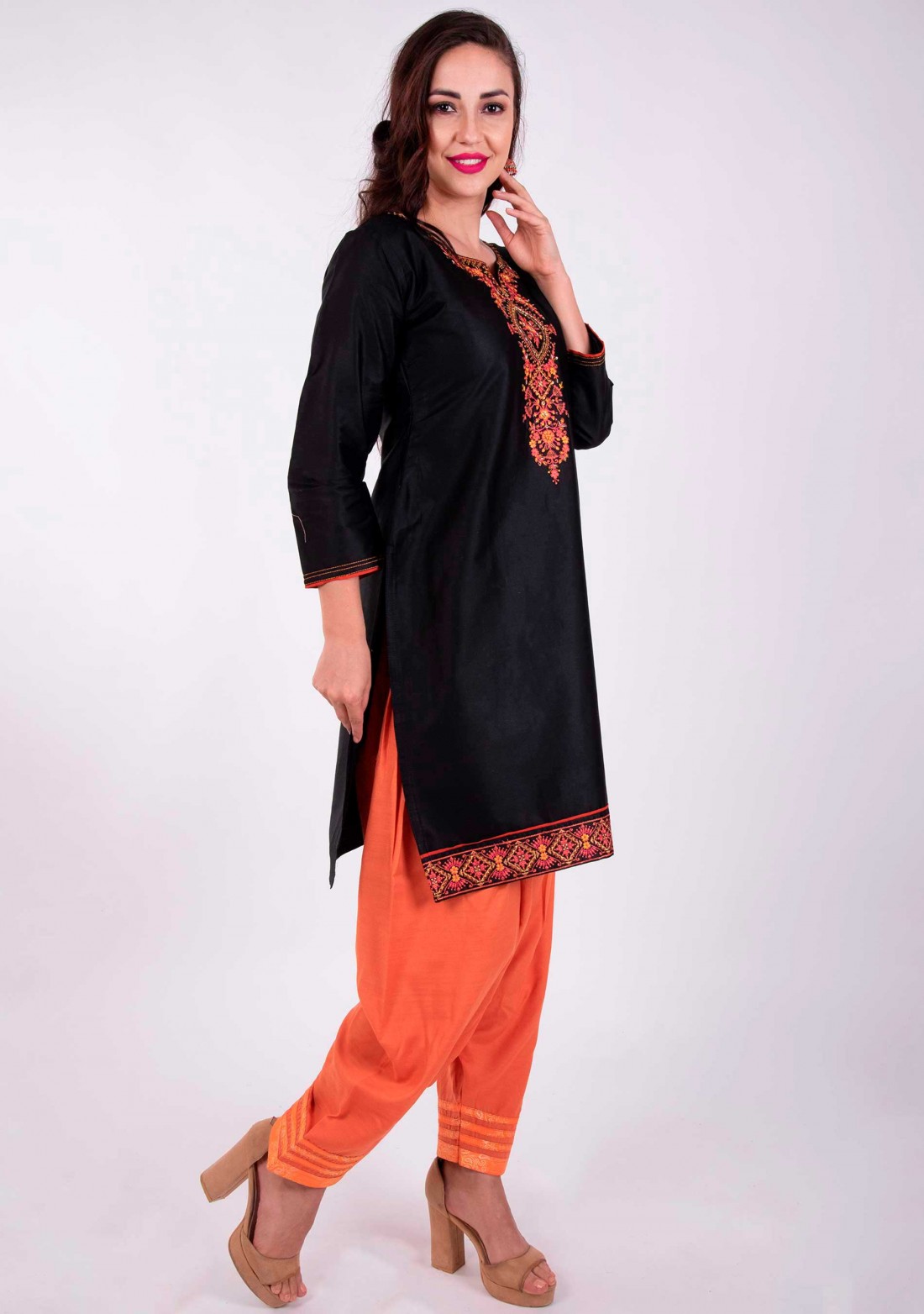 Add grace and charm to your look with this stunning salwar suit offered with a traditional banarasi dupatta. The subtle straight cut, three-quarter sleeve black color jam silk kurta is embellished with intricate Khatli embroidery on neckline and kurta hem. This is further highlighted with gold handwork done by expert artisans. The set comes with a peach slub rayon Patiala salwar with an elasticated waist and jacquard fabric patchwork on the hem that perfectly complements the contrast kurta. The soothing color combination makes this three-piece ethnic set perfect day wear. Fuse it up with heels and fine jewelry to look graceful on any festive occasion.
