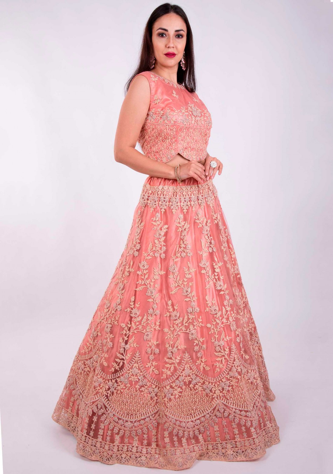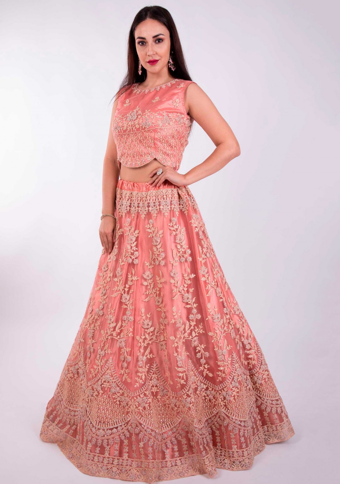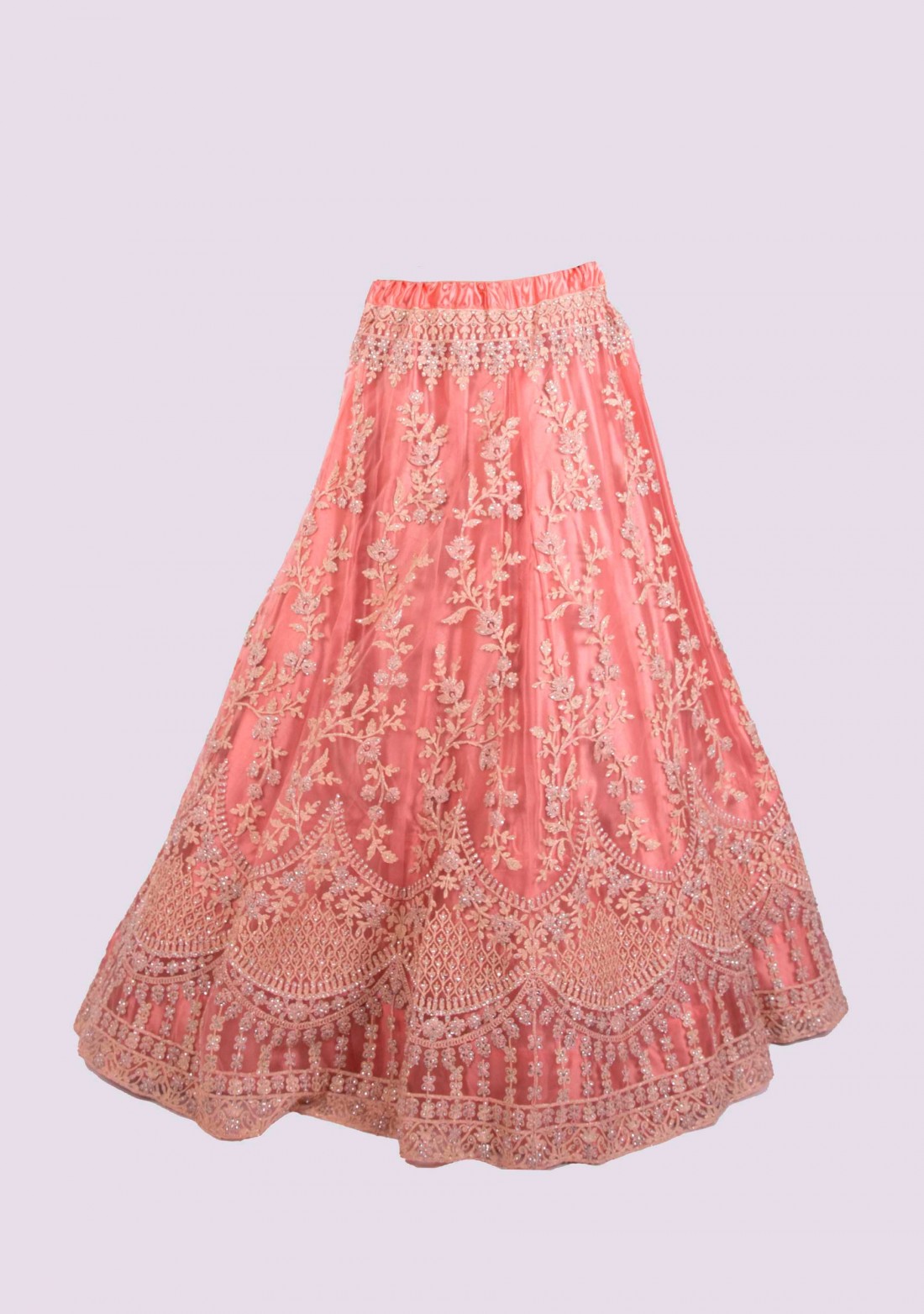 Look beautiful during the wedding season with this ethnic coral embroidered soft net lehenga choli. The piece comprises of premium chain stitch intricate tonal coding embroidered fabric choli, silk satin lining paired with heavy coding zaal work embroidered lehenga, and silk satin embroidered dupatta. The blouse featuring eye-catching zaal embroidery has a round front and back neck, and a straight hem. Silver stones on high-quality net fabric sewn all through-out the embroidery. Add to the drama with a classic pair of heels and traditional Indian style jewelry.